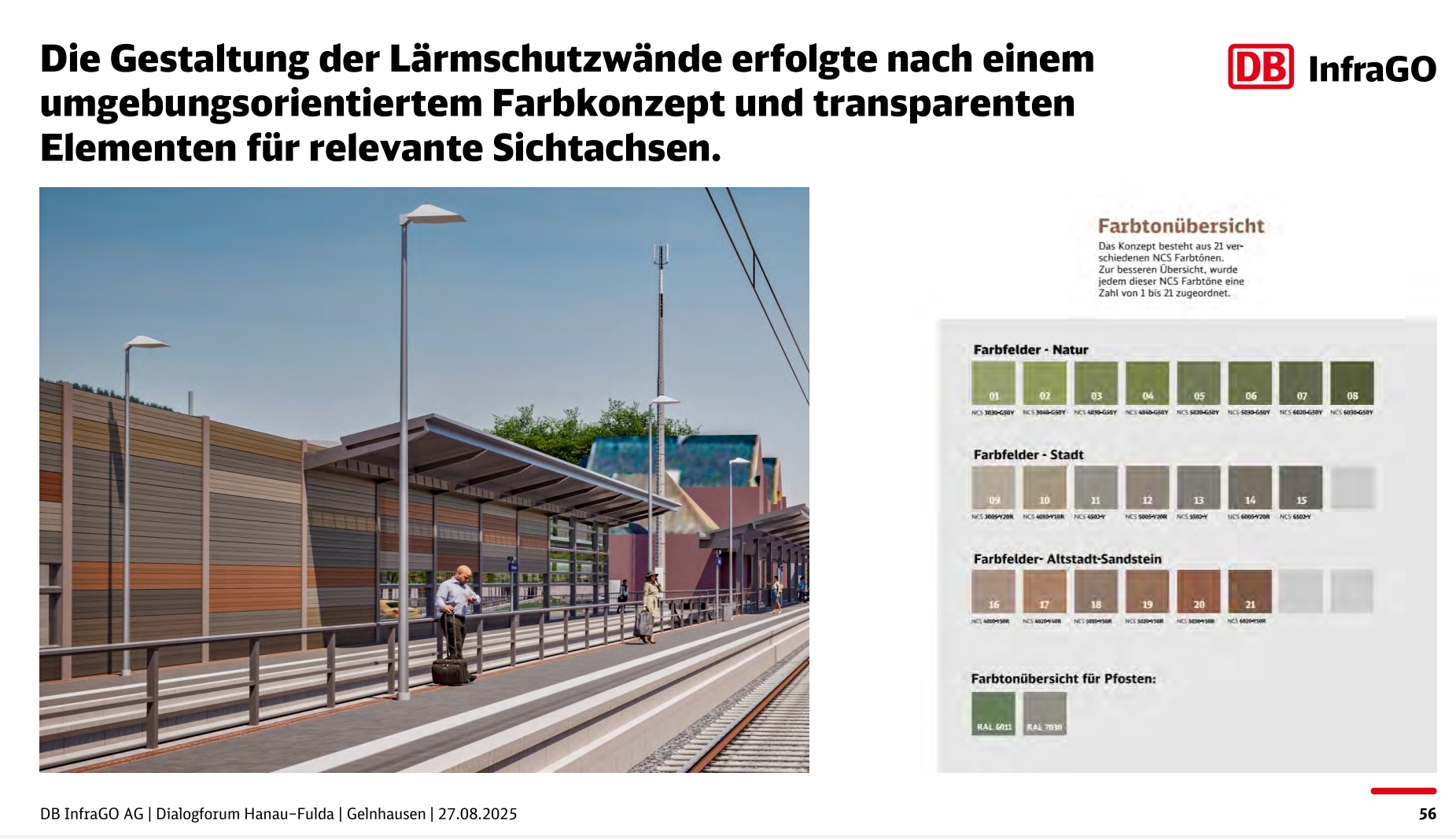 In der Stellungnahme werden Lärmschutzwände mit transparenten Elementen und umgebungsangepassten Farben erwähnt. Hier ein Beispiel eines hessischen Bahnhofsprojekts.