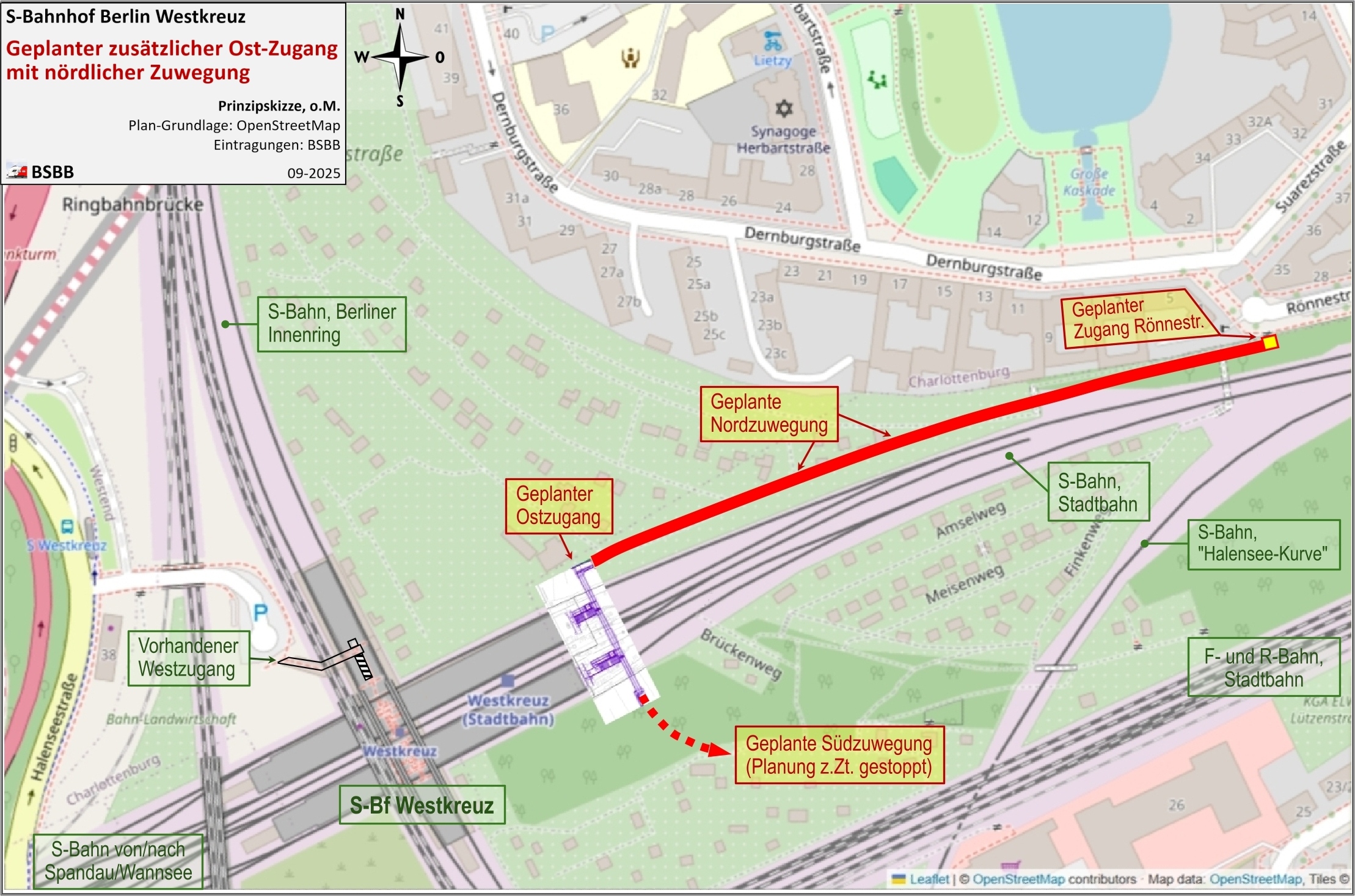 Das Eisenbahnbundesamt hat im August/September 2025 die Pläne für das Vorhaben „Neubau 2. Zugang (PÜ) inkl. nördliche Zuwegung am S-Bf. Berlin-Westkreuz“ ausgelegt.